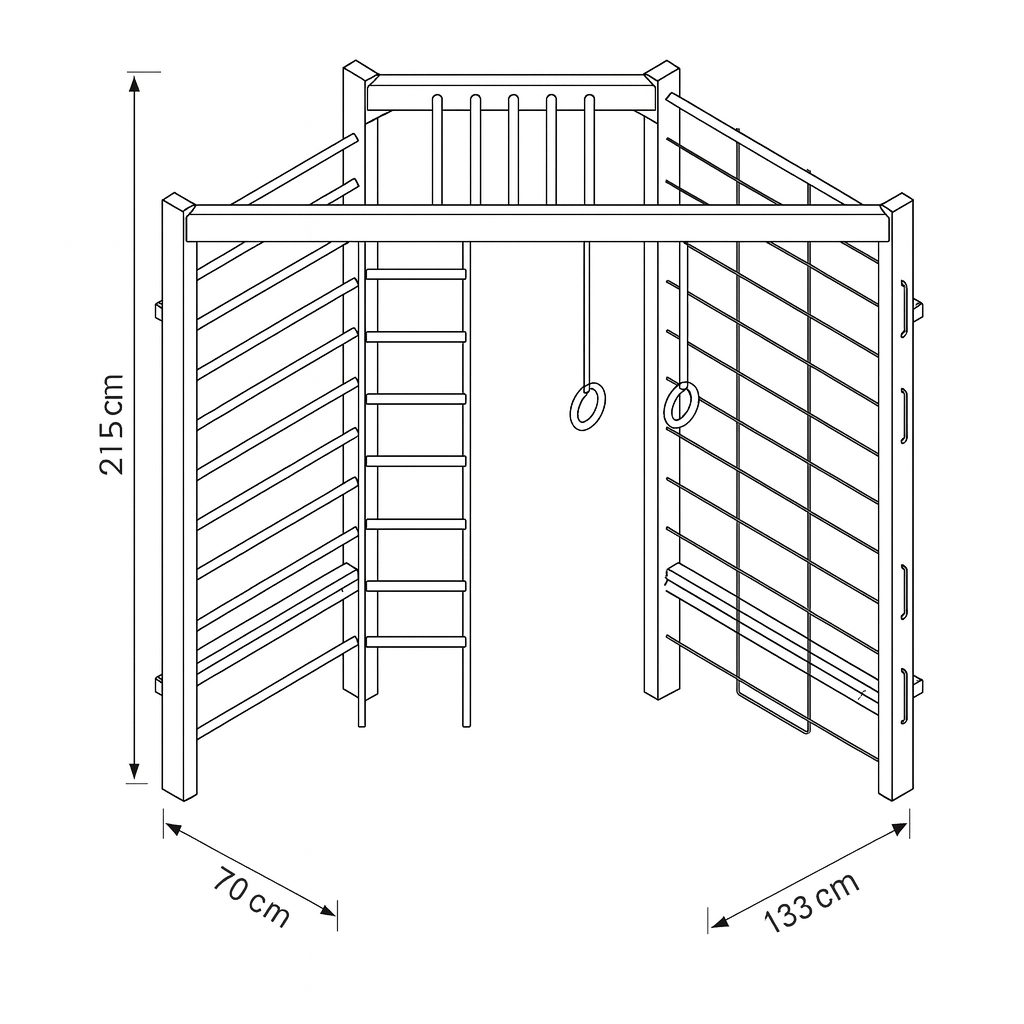 Im Set enthalten:– Sprossenwand– Gladiatornetz– Klettergerüste / Monkey Bar– Kletterseil– Gymnastikringe– Seilleiter– Montageset